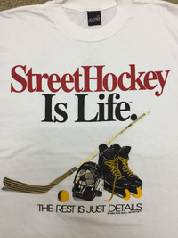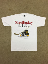 Vintage 1994 Street Hockey Is Life Single Stitch T-shirt MEASUREMENT: (Size : please refer to actual measurement given and compared with your best fitting clothes ) Size on tag: L Armpit to armpit: 22 inches Length: 32 inches Material : Cotton Condition : 8/10 (good vintage condition, small stain spot (can be remove after wash) - refer picture) PAYMENT & SHIPPING: ✔ Accept "PAYPAL" Only. Please drop your contact number & email after purchasing the item(s). This is important for the shipping purpose. ✔ This item will be ship along with Tracking Number within 3 working days after received a completed payment. ✔ Expected shipping period takes within 7 to 18 working days to arrive to its destination around the world. ✔ Please don't worry about Custom tax fees during Shipping because I always declared all items as a Gift and wrote the value lower than original price usually just $10 only. DEAR VALUED CUSTOMER: ✔ All Measurements were been measured flat on the floor. ✔ Please don't expect this item condition is 100% like new unless I have mention it. ✔ NO Return/Refund. Please do not hesitate to contact me if you have any inquiries. It’s my great pleasure to have a conversation with customers. ATTENTION: Please pay close attention to measurements provided. Do not rely on tag size as pre-worn items may have been altered, stretched or shrunk & vintage sizes do not directly translate the modern sizes. The best way to ensure a correct fit is to compare our measurements with the measurements of a similar item that you know fits you well. Please enlarge the photos for clearer image. ** Please do not expect the shirt in mint condition unless stated. It’s because vintage and used items may have sign of wear. Thank you very much for your visit. 😊