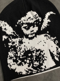 Japanese Brand - Deadstock Angel Skully Graphic No Cuff Knit Black Beanie OS