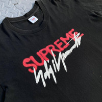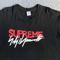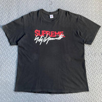 Supreme x Yohji Yamamoto AW20 Spellout Logo Tee Brand: Supreme x Yohji Yamamoto Year: 2020 Made in: USA Material: Cotton Color: Black Size on tag: XL Sizing: Measurements (flat, not stretched): Shoulders: 22” Sleeves: 8.5” Width: 24.5” Hem: 26” Length: 30.5” Color rating: 8/10 Condition overall: 7.5/10 Issues: hairline crackprints, dot stain, small holes DM here for more pics IG @archived_g_