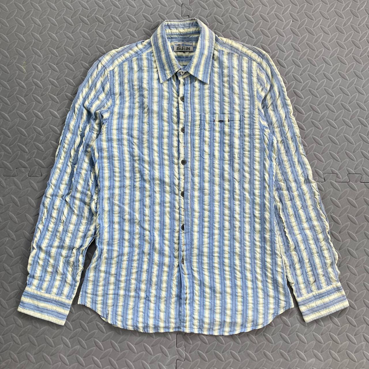 Vintage Vivienne Westwood Man Striped Wrinkled Shirt Brand: Vivienne Westwood Man Year: Color: Striped pastel yellow & blue Material: Cotton Size on tag: 50 Sizing: Measurements (flat, not stretched): Shoulders: 16” Sleeves: 25.5” Width: 18” Hem: 19” Length: 28” Color rating: 8.5/10 Condition overall: 8.5/10 Issues: signs of usage