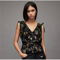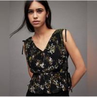 NWT All Saints Maia Viola Top SiZE: 10 RETAIL: $279 FEATURES V-neck Sleeveless, ties at shoulders Pullover style Drawstring at waist V-back Allover print MATERIAL & CARE 100% viscose Machine wash