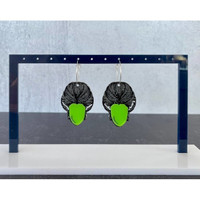 Beware of The Bride of Frankenstein! these earrings are a whimsical take on the Legand. black glitter acrylic laser cut and etched for the brides hair and of course her signature white lightening bolt streaks at her temples. Her green face with the telltale stiching scar runs down her jaw. These earrings are handmade by myself. I cut and layer each piece of acrylic. Acrylic being a plastic is extremely lightweight to wear. These earrings are comfortable for all day/all night wear.
