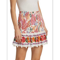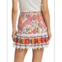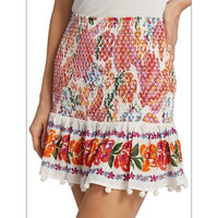 NWOT FARM RIO SMOCKED SKIRT!!! PRODUCT DETAILS This smocked Farm Rio miniskirt features a bright floral print and a ruffled hem finished with pom pom trim. SIZE: Large • Smocked waistband • Pull-on style • 100% cotton • Hand wash • Imported Length 18”