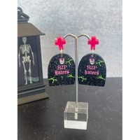 Rest In Peace Tombstone Acrylic Engraved Earrings. sizing details: approximately 2”wide & 2” long These earrings are handmade by myself. I cut and layer each piece of acrylic. I also hand paint the engraved areas. Acrylic being a plastic is extremely lightweight to wear. These earrings are comfortable for all day/all night wear.