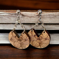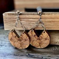 These beautiful wooden, engraved by laser earrings with funky chain detail are handmade by me. Size is ~ 2”