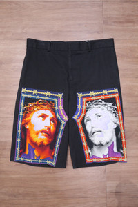 Givenchy - Riccardo Tisci - S/S 16 - Jesus-Print Bermuda Shorts Following his catholic roots as a guide for SS16, Riccardo Tisci explores elements of emancipation and incarceration with these Givenchy shorts. Featuring a mirrored image of Christ in his moment of passion, wreathed in thorns and hemmed by barbed wire for a streetwise twist, these ones bring the brand's eclectic vision to the forefront. Black cotton Cavalry twill multi-colour barb wire Jesus print at front criss-cross seams at back yoke Double back darts for fit zip fly with hook-and-bar secure Two side seam pockets, and two back welt pockets and belt loops Tagged Size: 48 Condition: 8.5/10 Flaws: Overall Fading and Piling Material: 100% Cotton Lining: 100% Cotton Zipper: YKK Made in: Portugal SRP: $890 Dimensions Waist: 33 Inseam: 13 Crotch: 12.5 Thigh: 12 Leg Opening: 10.5 TAKE NOTE: 1. Be mindful that this piece has led a previous life, and may tell its story through minor imperfection. 2. See measurements written in the description 3. In some rare cases, customs duty may be charged, but in that case, please pay by yourself Courier: DHL Express ONLY From: Philippines ETA: 2-4 days from the date of shipment