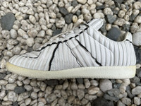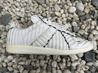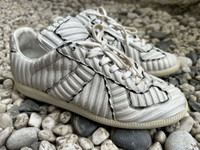Margiela - F/W 17 - 3D Replica Low Sneakers Hailed as one of the finest designers of his generation, Martin Margiela’s namesake brand continues to thrive this season. This is a fashion house which takes a radical approach to construction, realising staple pieces in a new and innovative light with every thoughtful iteration. The uppers of these 22 Replica Low 3D Sneakers are cut from a textured leather and sit atop a tonal rubber sole unit. This brands signature stitch detail to the heel signs off this pair, which are sure to add a futuristic flair to any ensemble this season. *Textured Leather Uppers *Suede Overlays *Debossed Tongue Branding *Single Stitch Branding *Gum Rubber Sole Tagged Size: 42 Condition: 9/10 Flaws: Signs of Usage (Yellowing of Laces, Tear on Garters on Lining) Made in: Italy SRP: 509 British Pounds