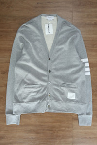 Thom Browne - 4-Bar Loopback Jersey V-Neck Cardigan *Light Grey V-Neck Cardigan *Classic Loopback Jersey *Engineered 4-Bar Stripe *Button Front *Welt Pockets *Thom Browne 4-Bar Tag *Signature Grosgrain Loop Tab Tagged Size: 5 Condition: 9.5/10 Flaws: 1 Spot on Sleeve Material: 100% Cotton Made in: Japan Dimensions Length: 30 Width: 22.5 Shoulder: 20.5 Sleeve: 30 TAKE NOTE: 1. Be mindful that this piece has led a previous life, and may tell its story through minor imperfection. 2. See measurements written in the description 3. In some rare cases, customs duty may be charged, but in that case, please pay by yourself Courier: DHL Express ONLY From: Philippines ETA: 2-4 days from the date of shipment