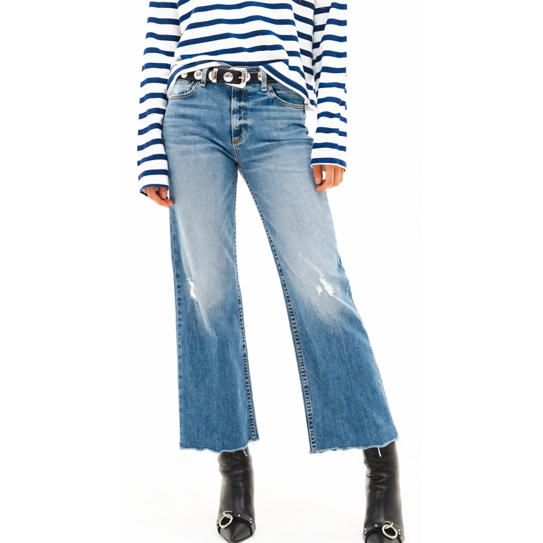 A high-rise wide leg cropped just above the ankle. The Trestles wash has just the right amount of fading and distressing for a lived-in look. Made from soft stretch Japanese denim with a raw hem. - 11" rise / 26" inseam / 20" leg opening - 98% cotton / 2% polyurethane - 12 oz Japanese stretch denim - Made in Los Angeles