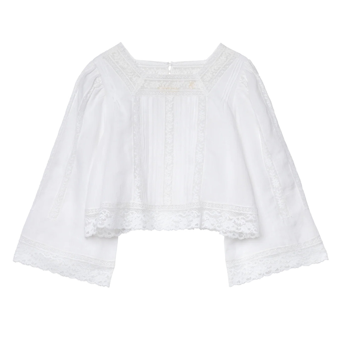In crisp, lightweight ramie, the Solstice Top features a boxy silhouette and bracelet-length sleeves, detailed with Edwardian-inspired pintucks and lace throughout. Two delicate mother-of-pearl buttons fasten at the back of the neck. 100% Ramie