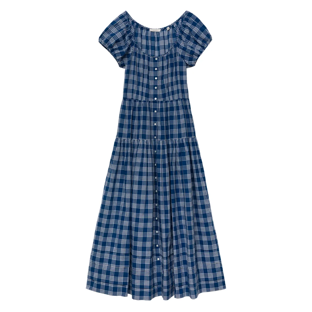 Crafted from midweight organic cotton voile woven with yarn-dyed Dorset Plaid, the Valenne Dress is an easy-going silhouette with sweet short sleeves and a full, ankle-grazing tiered skirt. It’s fitted at the waist with ‘50s-inspired darting, and the line of mother-of-pearl buttons down the center front can be worn fully closed or slightly undone. - Made in India - 100% Organic Cotton