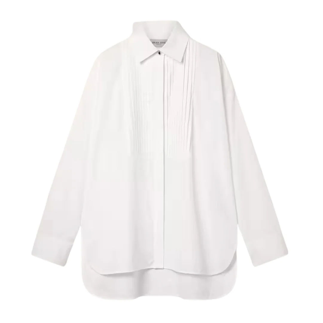 Made of white cotton poplin, this women's shirt features an oversized fit accentuated by a pleated bib on the front and jeweled cuffs. The concealed effect fastening with mother-of-pearl buttons complemented by a jewel button on the collar for a distinctive accent, and the iconic double star on the back complete the look. - Color: white - Oversized fit / Pleated bib on the front / Back yoke / Rounded hem / Jewel button at the neck / Jewel cuffs / Concealed effect fastening with mother-of-pearl buttons - Double star on the back - Main material: 100% cotton - Made in Italy