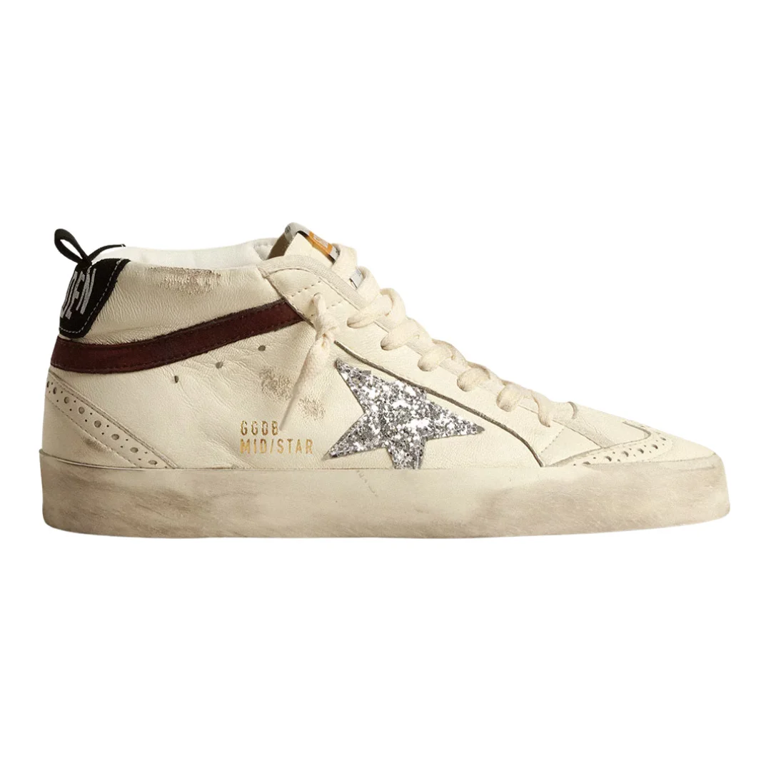This limited edition Mid Star model with an off-white nappa leather upper features a silver glitter star and a brown nubuck flash. The black suede heel tab and off-white laces complete the look. - Off-white nappa leather upper - Silver glitter star - Black suede heel tab - Brown nubuck flash - Broguing detail - Off-white laces - Vintage finish - Handmade - Made in Italy