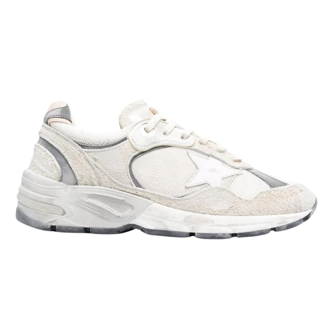 White leather trainers from Golden Goose featuring distressed suede and mesh. - White mesh and suede upper - White leather star - Beige leather heel tab with reflective fabric inserts - Cream-colored laces - Vintage finish - Handmade - Made in Italy