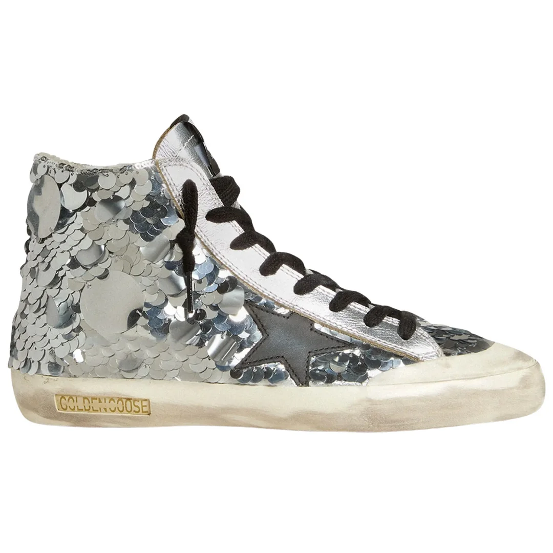 Francy sneakers Made in Italy - silver - sequin embellishment - leather tongue - high-top design - lace-up fastening - Outer: Polyamide 42%, Calf Leather 31%, Polyester 14%, Polyurethane 13% - Lining: Cotton 51%, Calf Leather 32%, Polyurethane 10%, Polyester 5%, Viscose 2% / Sole: Rubber 100%
