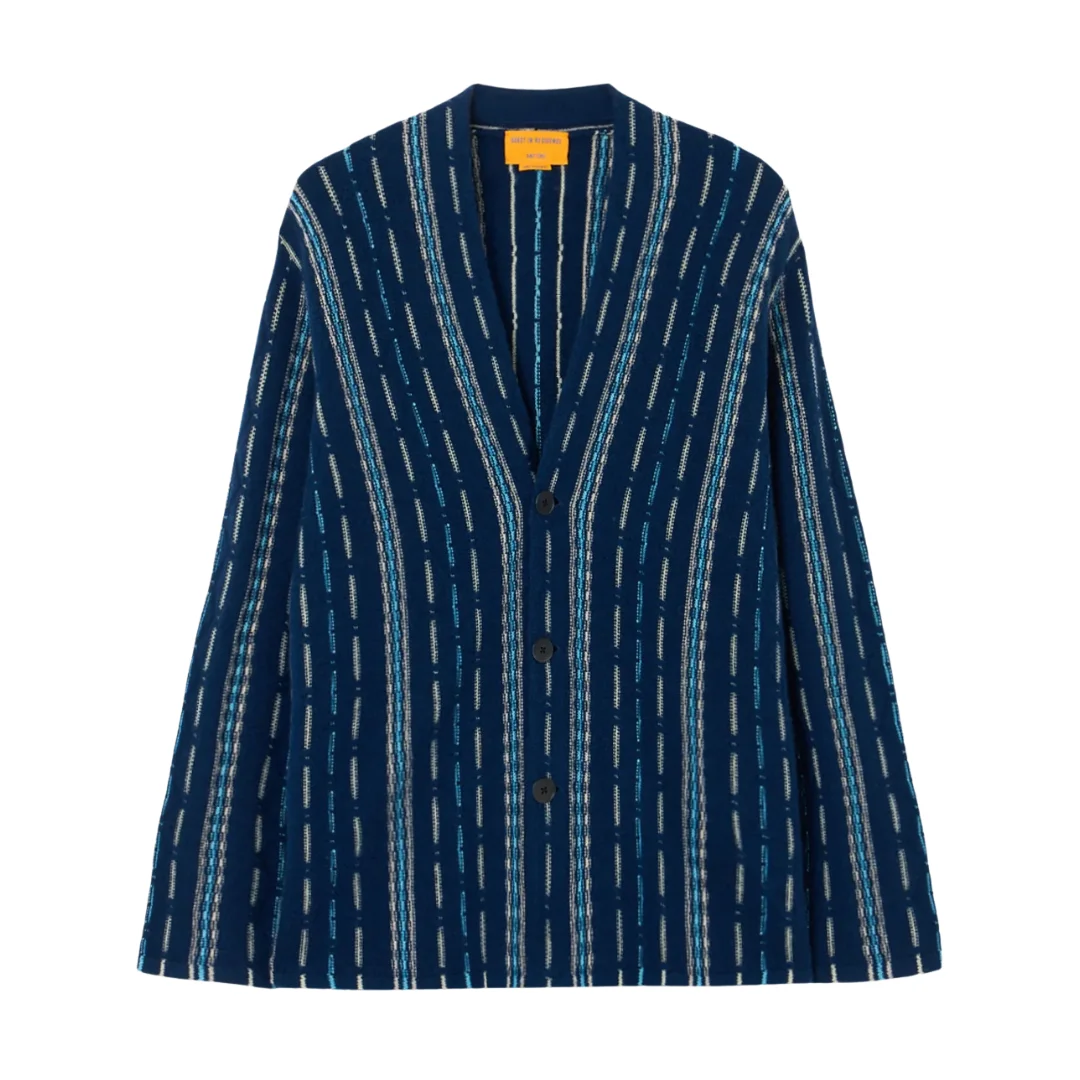 The Baja Everywear Cardigan is a striped cardigan featuring signature Everywear silhouette, updated with a four-color jacquard stripe and raised texture. This mid-weight knit cardigan is finished with a three-button front and relaxed shape, making it an effortless layer worn open or buttoned up. - Medium-weight - Three-button closure - Shawl collar stand - JACQUARD THREE-COLOR STRIPED / HORIZONTAL KNIT / SELF-FINISH AT HEMS - Signature GIR branding at center back neck - 100% Cashmere
