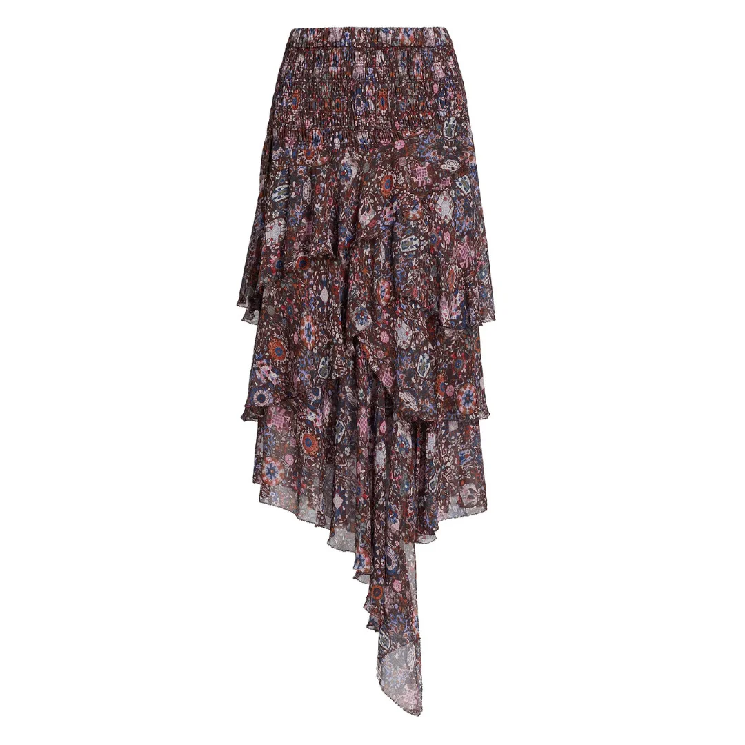 Brigitte frilly printed midi skirt - Frilly printed georgette tapestry pattern skirt - Elastic waist - Smocks on the waist - Rows of frills - Pointed asymmetrical hem - Plain-colored crepe skirt bottom - Flared and flowing cut, fitted at the waist - 100% viscose