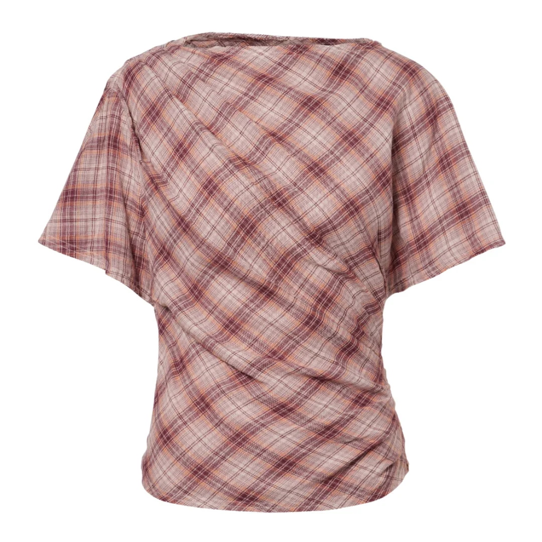 Neyela asymmetrical checkered top - Asymmetrical checkered cotton top - Asymmetrical neckline - Pleated shoulder and side - Short sleeves - Zippered side - Rounded hem - Raw-edge finishes - Fitted cut - 100% cotton