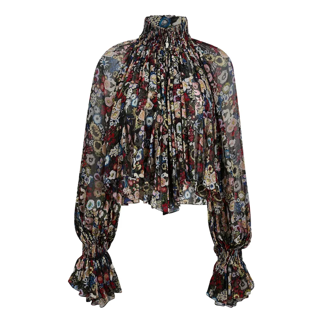 Fusing ‘90s grunge with a bohemian spirit, this fluidly formed shirt is framed by a high stand collar for a regal bearing. Cutaway silhouette animated by hand-crushed cartridge pleating, with billowing sleeves cinched at the wrist. Wear with slit neckline at front or back. Floral chiffon (100% silk)