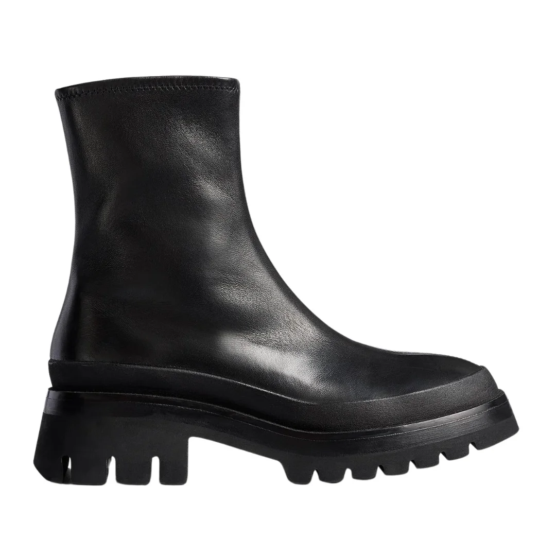 A refined, rounded-toe city boot grounded by a rubber bumper and a robust lug sole that is layered for lightness. Crafted in Italy of soft nappa lambskin infused with stretch for all-day comfort and lined in scuba jersey. Concealed side zipper. Signature gold staple detail at outsole. Origin: Made in Italy Stretch nappa (100% lambskin)