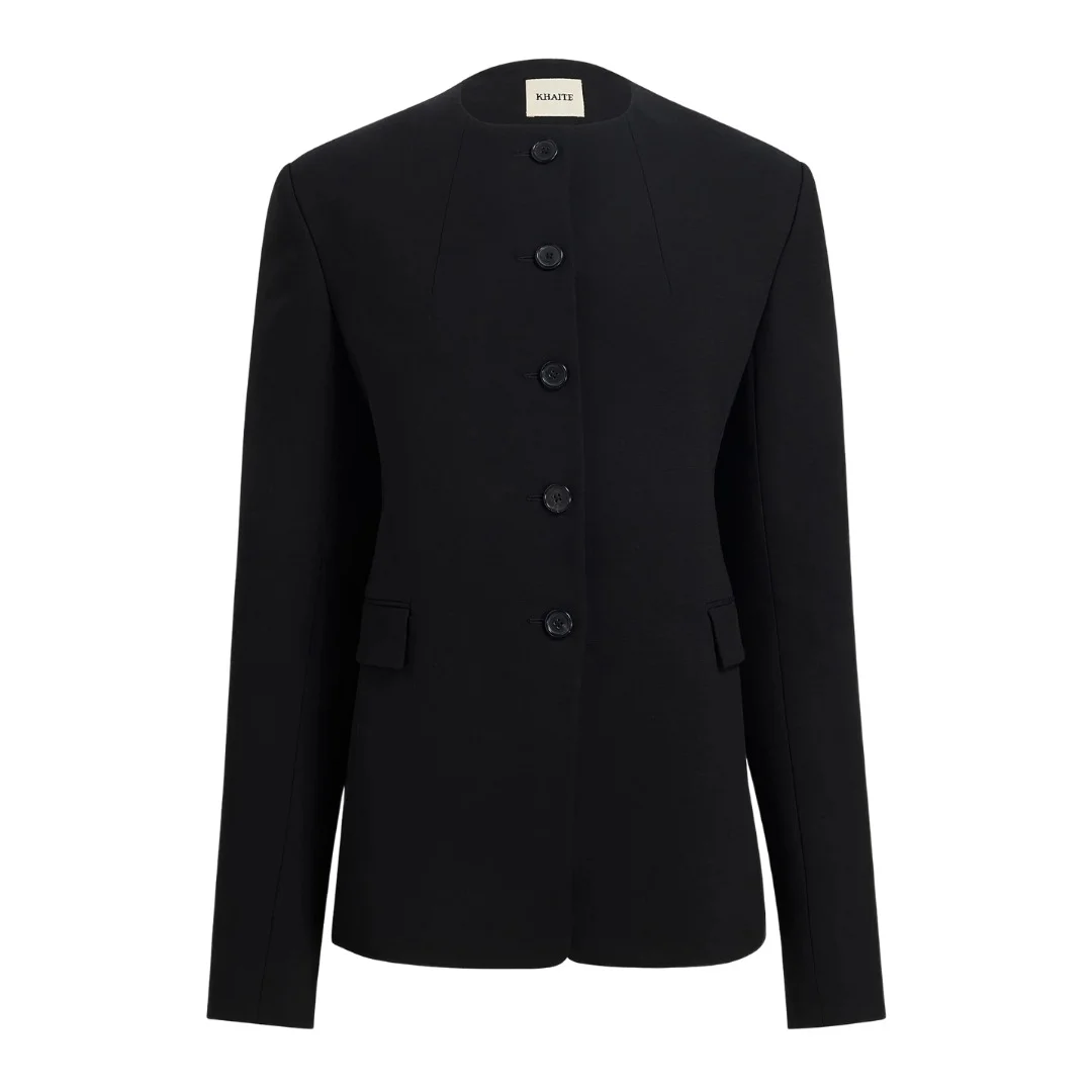 Tailored ease in smooth stretch suiting. A collarless silhouette of clean lines and refined details. Diagonal shoulder seams, subtle shoulder pads, welted flap pockets, and tonal buttons at placket and cuffs. Lined in silky cupro twill. Stretch viscose suiting (78% viscose, 21% virgin wool, 1% elastane)