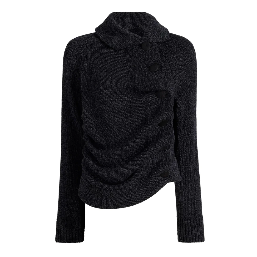 A fluid and sculptural cardigan in a blend of silk and cotton. The draped collar and placket introduce striking asymmetry, creating soft gatherings and a dynamic hem. Refined by haircalf buttons and 1x1 ribbing. Cotton silk chain (55% silk, 45% cotton)