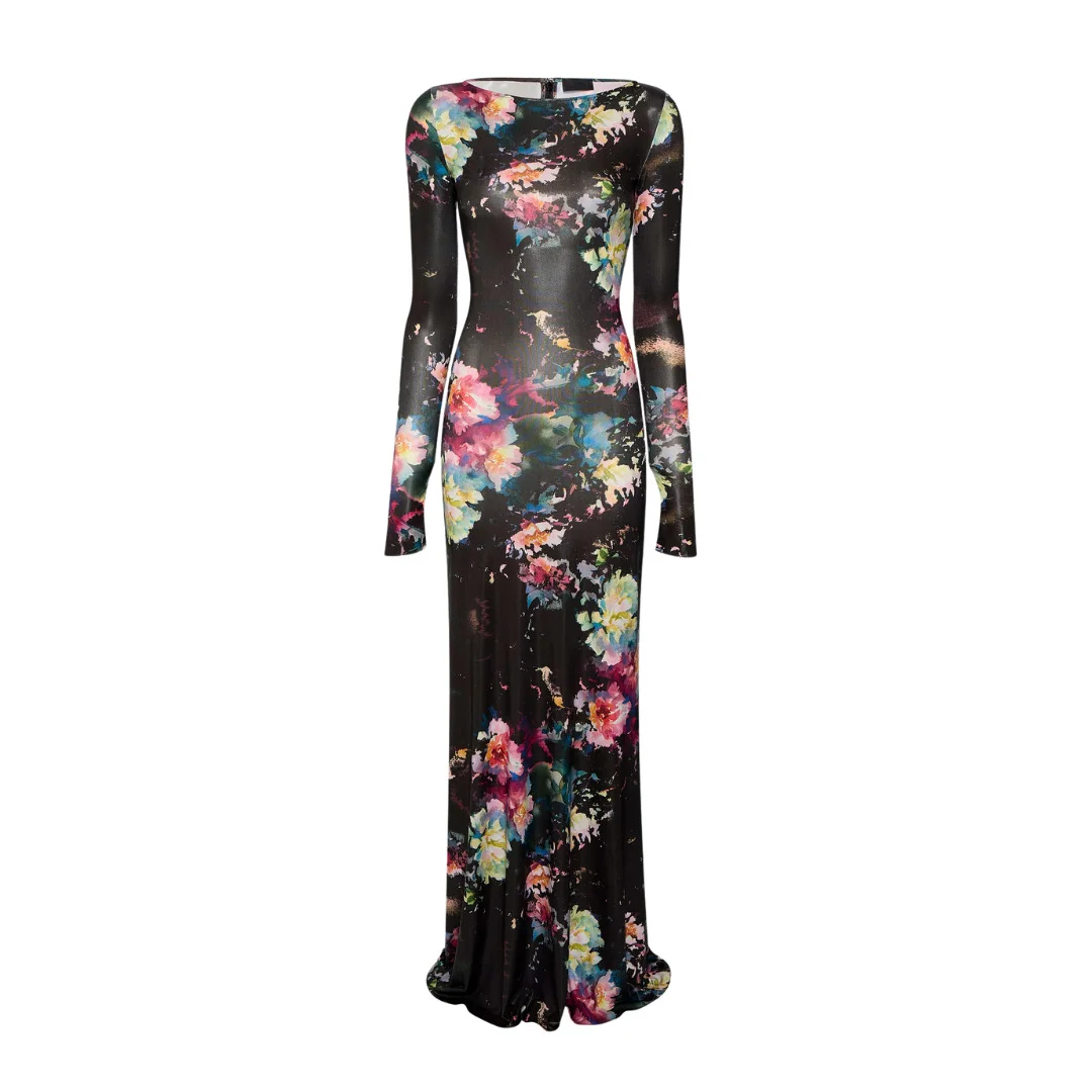 Long sleeve floral maxi gown in our ultra-comfortable, lightweight stretch jersey with boatneck and elongated sleeves. Fastens with zipper at back neck. - Material: 94% Polyester, 6% Spandex