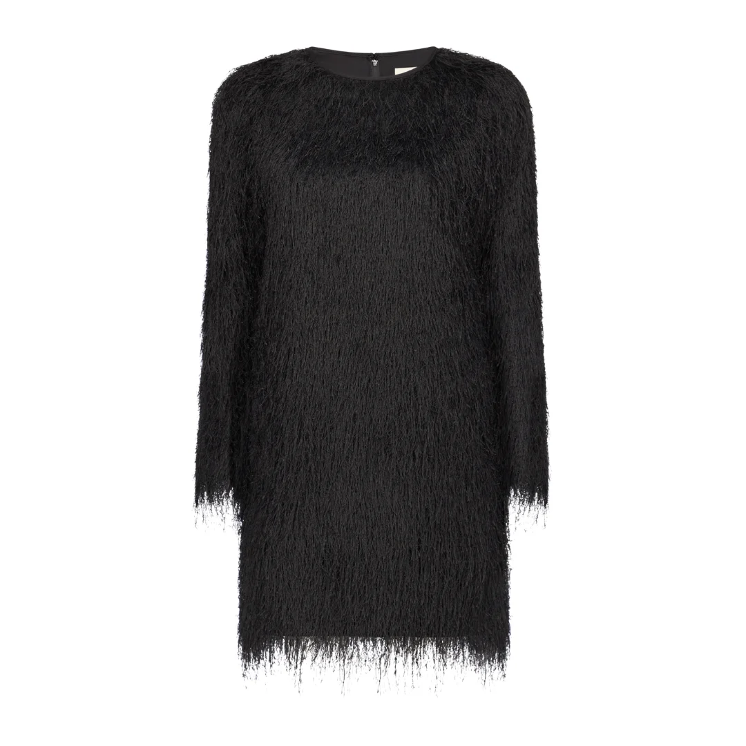 This mini dress is made of a long fringe fabric. Its straight fit, long sleeves and crew neckline enhance its unique texture, creating an elevated silhouette. - Composition : 100% POLYESTER