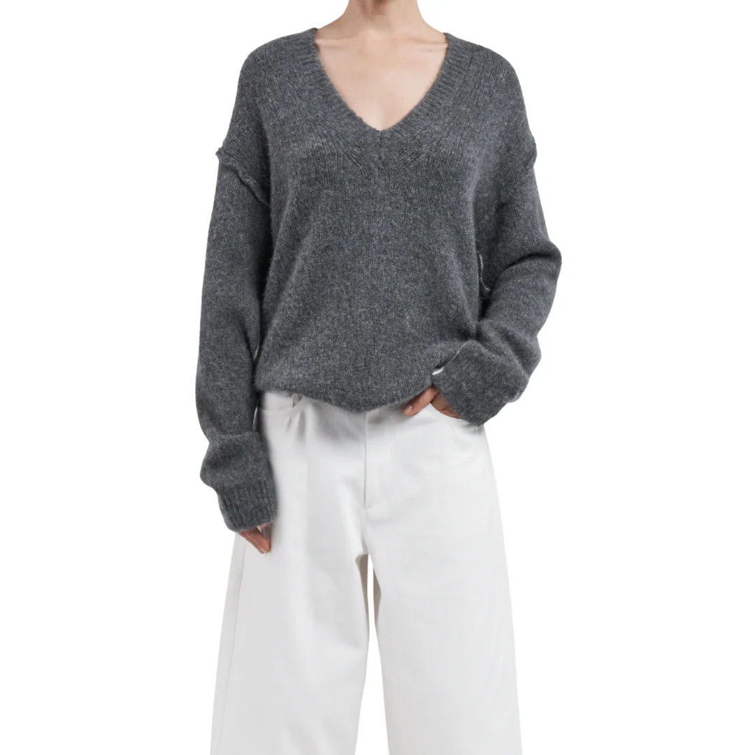 Knit from a fluffy airspun Italian cashmere in a steele grey, this V-neck sweater features oversized drop shoulders and our signature cape sleeve slits—an innovative open arm detail that allows the sweater to be worn traditionally or, by slipping your arms through, transforms it into a chic cape for an elevated look. - 100% Cashmere - Cape Slit Sleeves