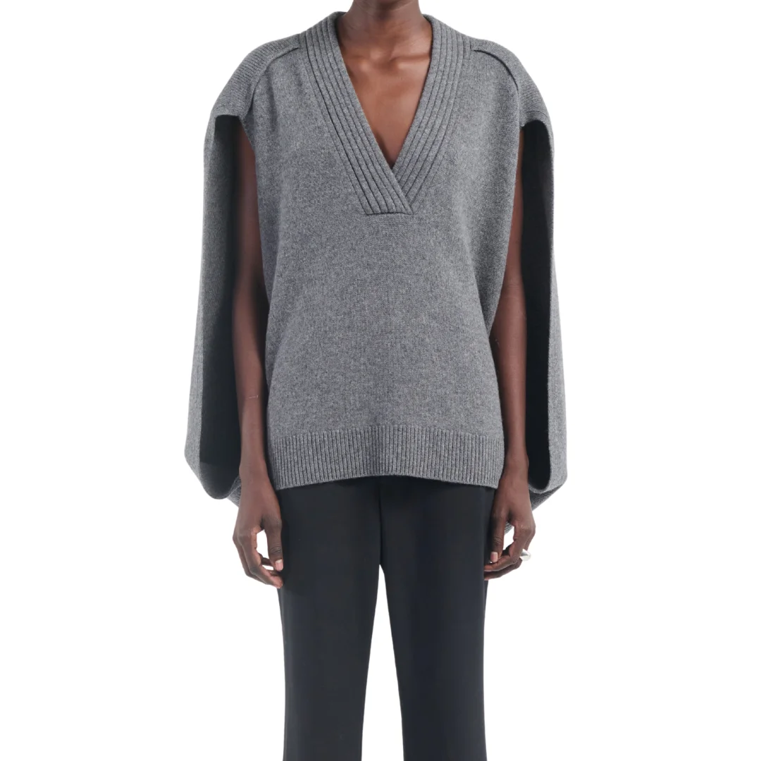 The Cocoon Cape Sweater is made in an medium grey responsible alpaca-wool blend. It is a v-neck vest with a beautiful cape-like back that cocoons the body and buttons at the sides. 49% ALPACA 21% MERINO WOOL 21% RECYCLED NYLON 9% NYLON