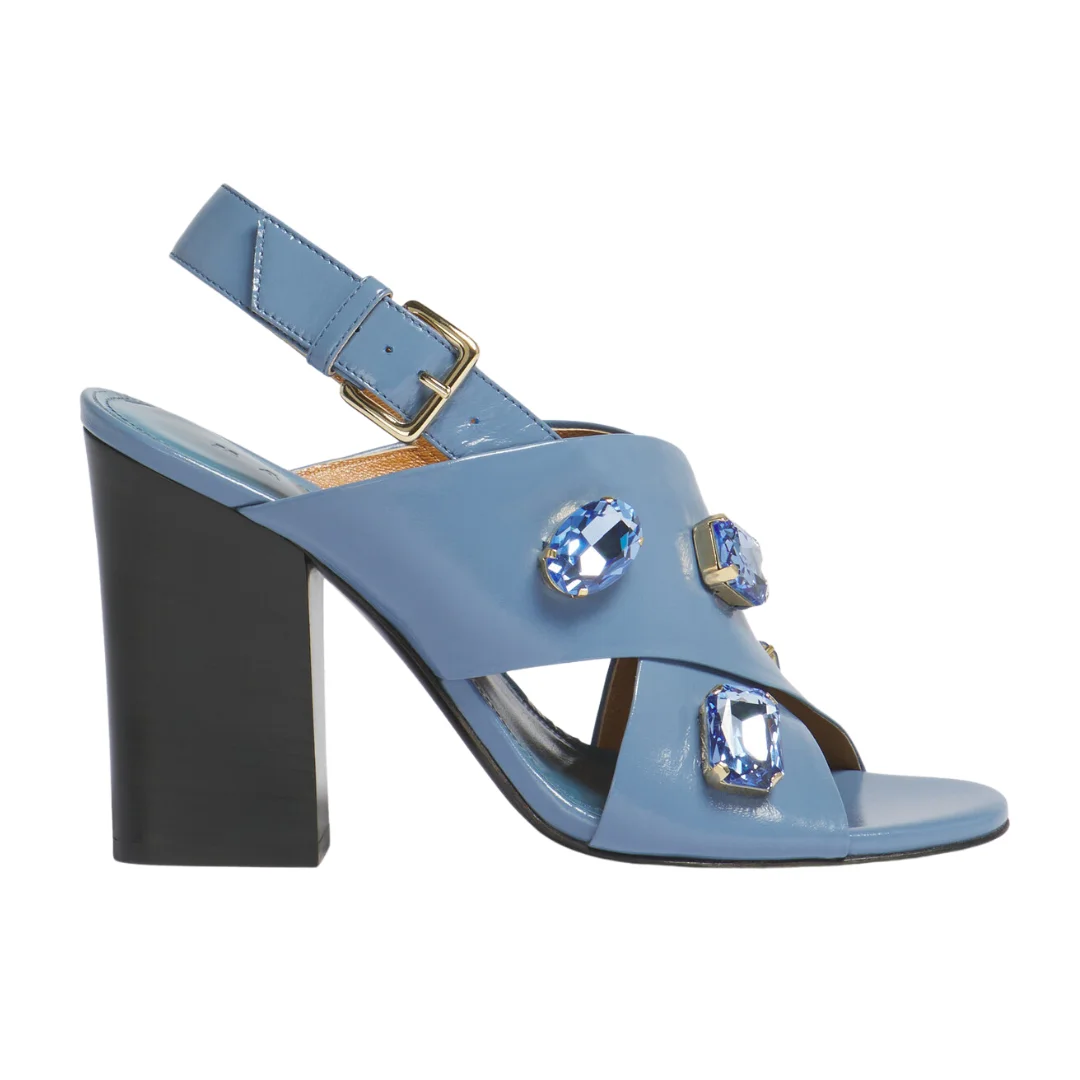 Open-toe sandal with criss-cross straps, crafted from glossy kidskin leather. Hand-embellished with three different shaped crystals, each encased within a light gold metal setting. Adjustable buckled slingback strap and high block heel. Leather lining. Made in Italy - Upper: 100% Ovine Leather - Application: 100% Glass - Inside: 100% Ovine Leather - Sole: 100% Calf Leather