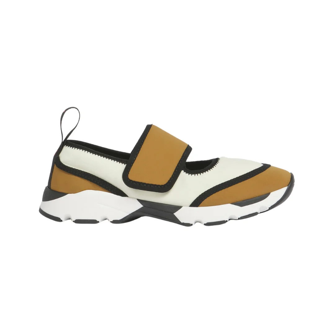 Mary Jane ballet flat and running sneaker hybrid, made from stretch lycra. Two-tone design with bold contrast piping. Unstructured slip-on style with wide velcro strap. Logo pull tab on the heel. Soft rubber sole. Made in Italy - Upper: 80% Polyamide - Nylon 20% Elastane - Spandex - Sole: 100% Rubber