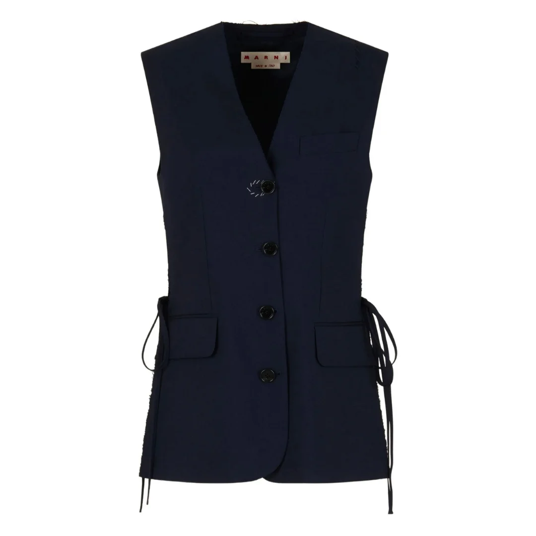 Deep blue wool waistcoat with side slits V-neck waistcoat made from tropical wool, putting a subverted spin on classic tailoring. Raw-cut side slits with adjustable ties. Upper welt pocket and lower flap pockets. Button closure. Hand-embroidered Marni Symbol on the shoulder and Marni Mending around the buttonhole. Lined. Made in Italy Primary Fabric: 100% Virgin Wool Woven - Lining: 100% Viscose-Rayon - Lining: 100% Viscose-Rayon - Lining: 100% Viscose-Rayon - Lining: 100% Viscose-Rayon Woven