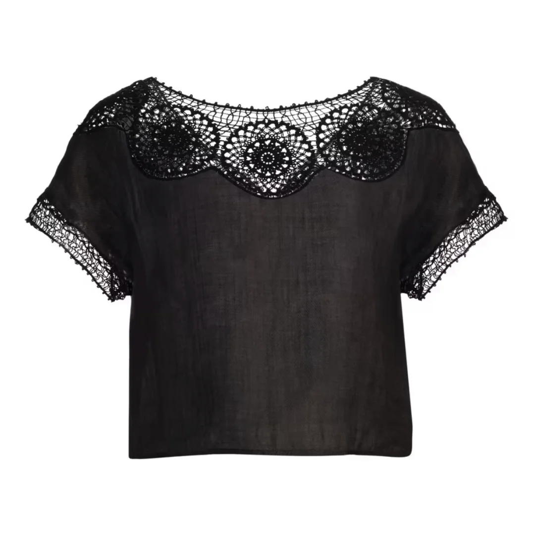 Cropped pullover top in Indian dobbie ramie. Cotton crochet detail at front and back yoke and sleeve. 100% Ramie