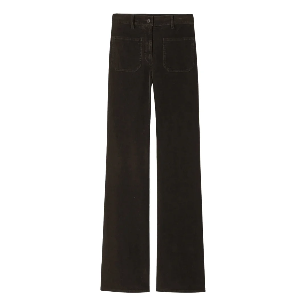 High-rise flare leg pant in corduroy. Front and back top stitched patch pockets. Button fly. Button closure. Belt loops. Designed for a 34" inseam. - Made in USA - 93% Cotton, 6% Polyester, 1% Polyurethane