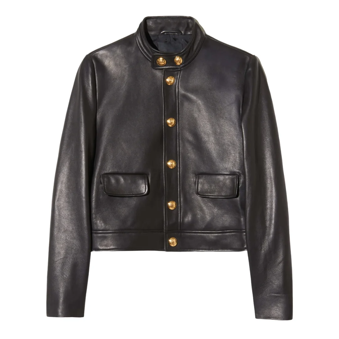 Cropped jacket with snap closures at front, neck, and sleeves. Functional pocket flaps and waistband detailing. Fully lined. - 100% Lambskin Leather