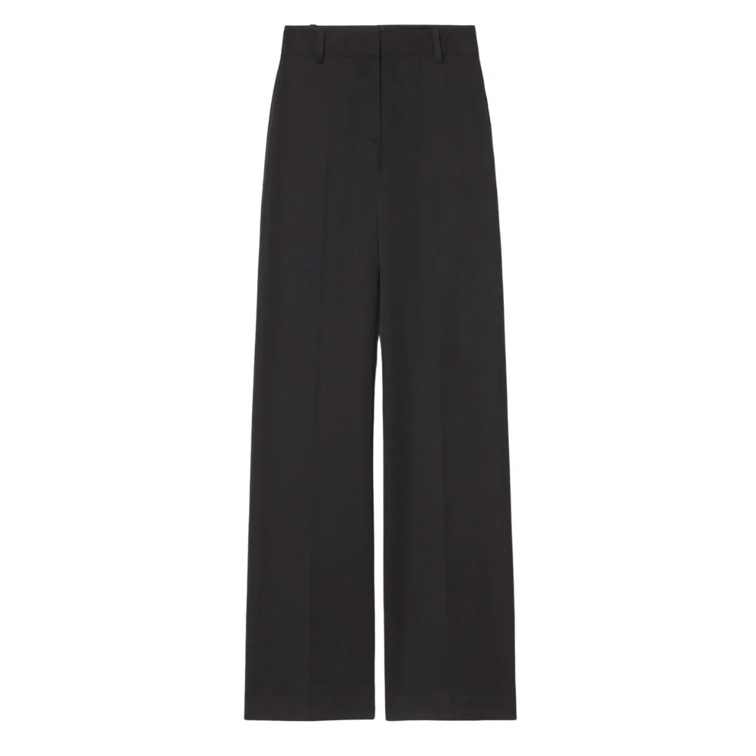High-rise pant relaxed through the thigh and hip. Belt loops at waistband. Back welt pockets. Color is Black 100% Virgin Wool