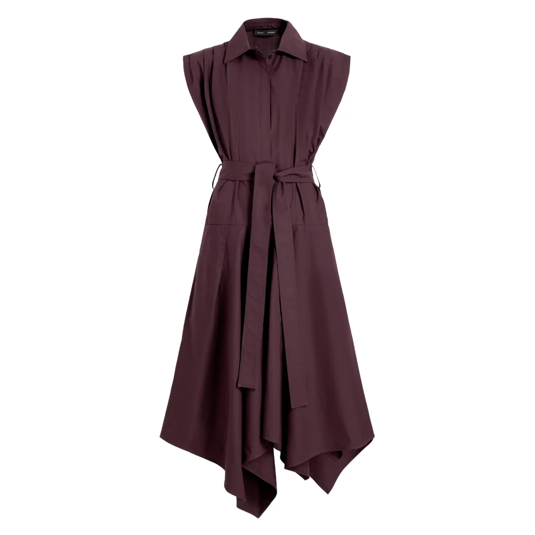 The Adinna Dress in Classic Cotton Shirting features shoulder pleating and a voluminous silhouette, with a button-down collar and a concealed front placket. Finished with a waist belt to create a defined shape, the dress is completed with an asymmetrical scarf hem. - Aubergine - Point collar - Short sleeves - Self-tie waist belt - Asymmetrical hem - Shirt dress silhouette - 100% Cotton