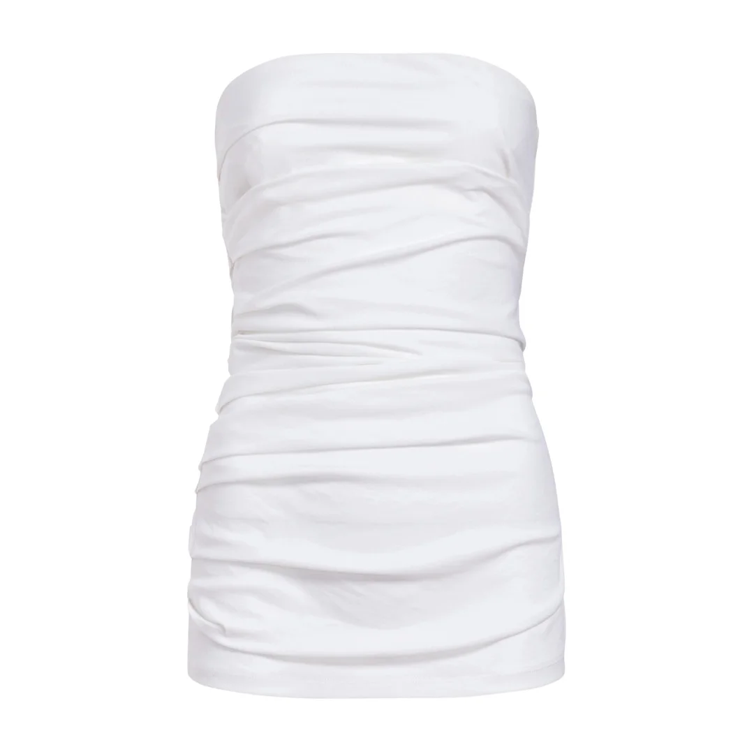 The Lena Top in Bi-Stretch Cotton Nylon is crafted to a ruched strapless silhouette with subtle tucks, finished with an exaggerated self-tie at the back. - Off white - Strapless - Ruched body - Side zipper closure - Self-tie back - 73% cotton, 20% polyamide, 7% elastane