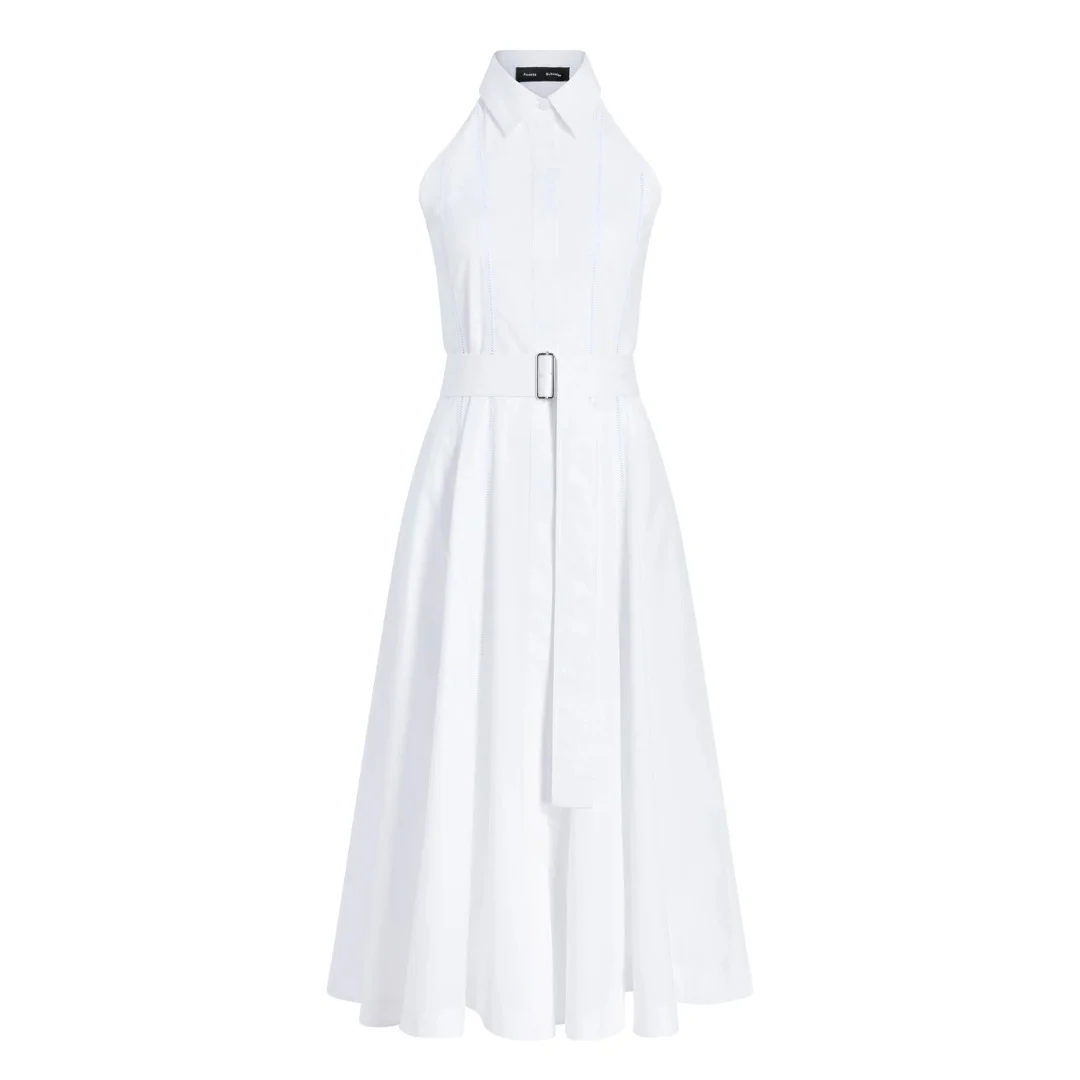 The Dorothy Dress in Eco Cotton Poplin features a high angular neck with a point collar. Detailed with eyelet trim along the bodice and includes a slider belt to accentuate the waist. - White - High neck - Point collar - Sleeveless - Concealed front placket - Slider waist belt - Side slip pockets - Eyelet trim - Mid-length hem - Slim fit - 96% cotton, 4% elastane