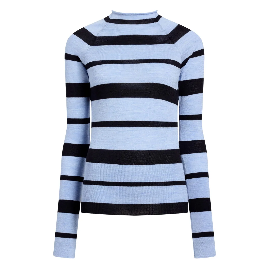 The Gia Top in Superfine Merino Silk is crafted to a slim silhouette with a high rolled neckline and contrast stripe pattern. - Blue multi - High roll neck - Long sleeves - Straight hem - Slim fit - 71% wool, 29% silk