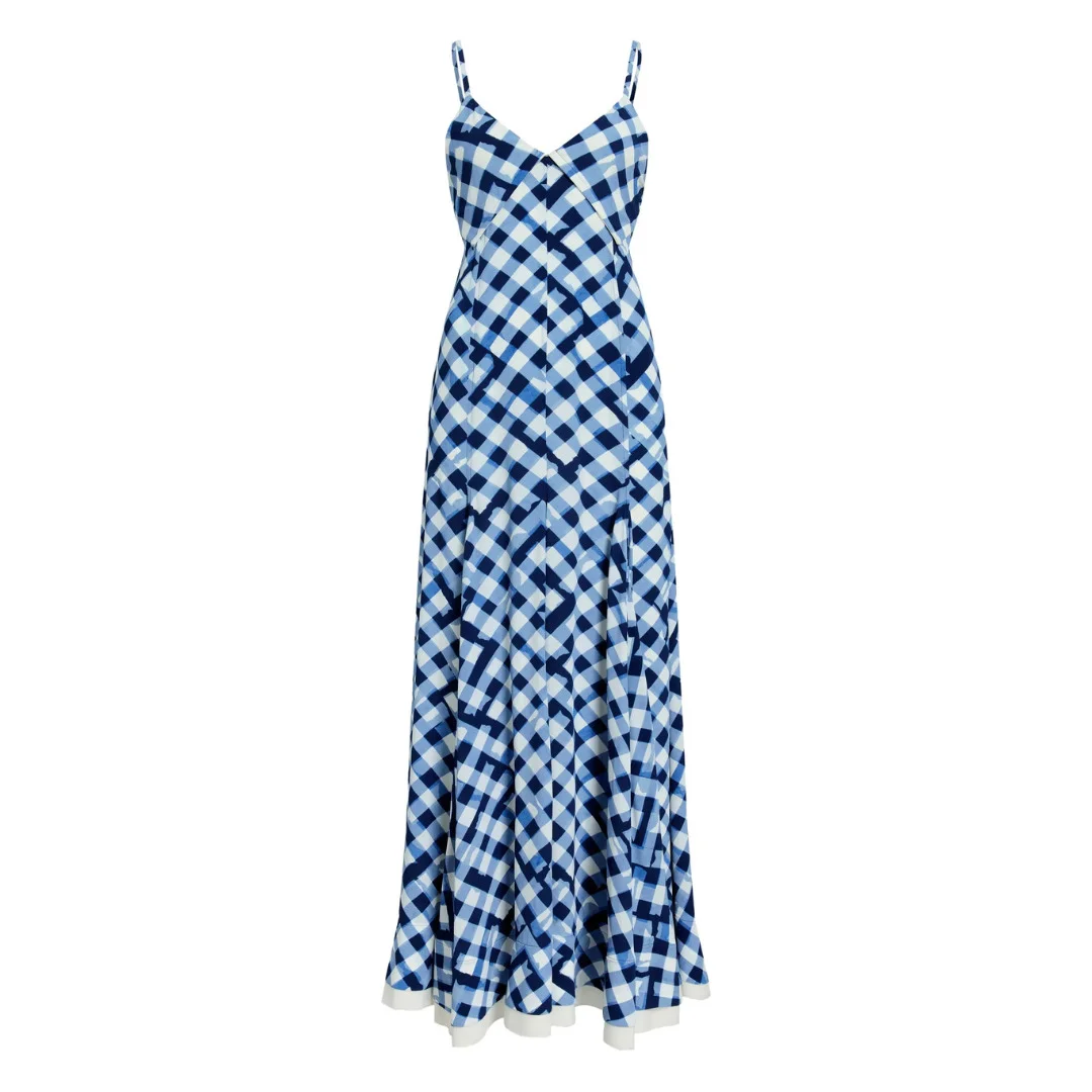 The June Dress in Printed Crepe De Chine features an A-line silhouette. Designed with a self-tie to gently define the waist, it features a maxi length and a subtle double hem detail. - Dark navy multi - V-neckline - Thin shoulder straps - Self-tie fastening - Center back zipper closure - Double hem detailing - Maxi-length - Slip silhouette - Lined - 100% viscose