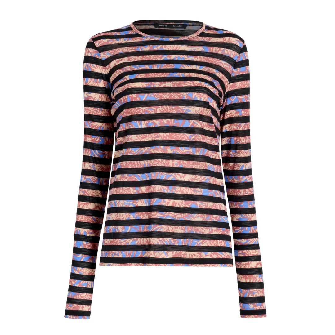 The Mia Top in Printed Tissue Jersey is cut from ultra-soft tissue jersey, featuring an all-over striped chrysanthemum print. Designed with a skimming silhouette, it includes a crew neckline and long sleeves. - Pink multi - Soft tissue jersey - Crew neckline - Long sleeves - Relaxed fit - Straight hem - 100% Cotton