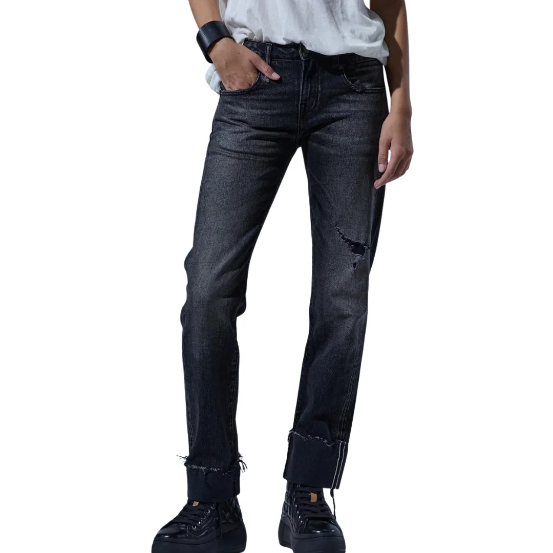 R13's iconic slim fit Boy Straight featuring a low rise and slim straight cropped leg built with black Japanese selvedge stretch denim and featuring heavily distressed cuffs. - Color: Cinder Selvedge Black - 98% Cotton, 2% Polyurethane