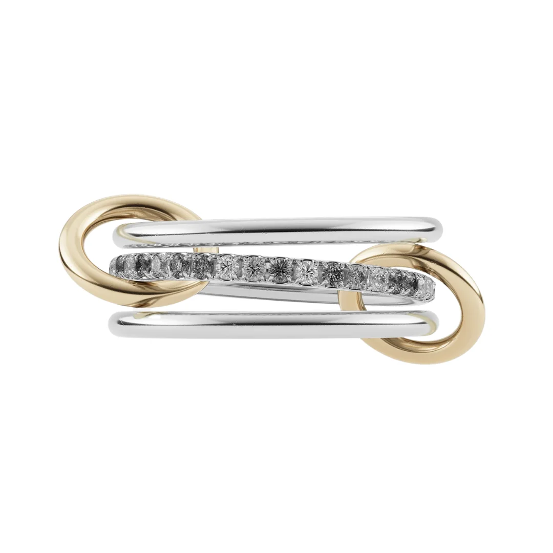 The Sonny ring was forged with simplicity in mind. Its core band of pave diamonds is framed by two outer bands of solid metal, linked by two matching connectors. The Sonny features thin 1.7mm bands, and is perfect for stacking. Ideally suited for everyday wear. Each Sonny is individually handmade in Los Angeles. - Bands: .925 sterling silver - 1.7mm gauge .925 sterling silver bands - 1.7mm gauge .925 sterling silver bands - 1.7mm gauge .925 sterling silver bands - Diamonds: Gray diamonds (approx. 0.50 cttw) - Connectors: 18k yellow gold - SIZE 7 Each gray diamond is a unique, natural stone and will vary in color. All gray diamonds are ethically and responsibly sourced by the SK team.
