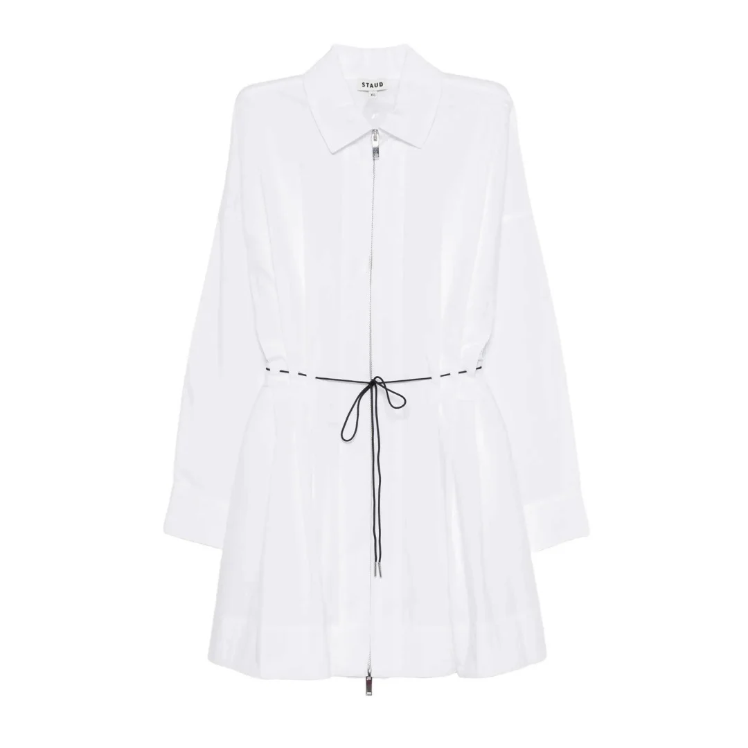 Crisp stretch poplin dress with a classic collared neckline and front zipper closure. Defined pleats and an adjustable waist tie create a flattering silhouette. 7% Cotton, 3% Spandex