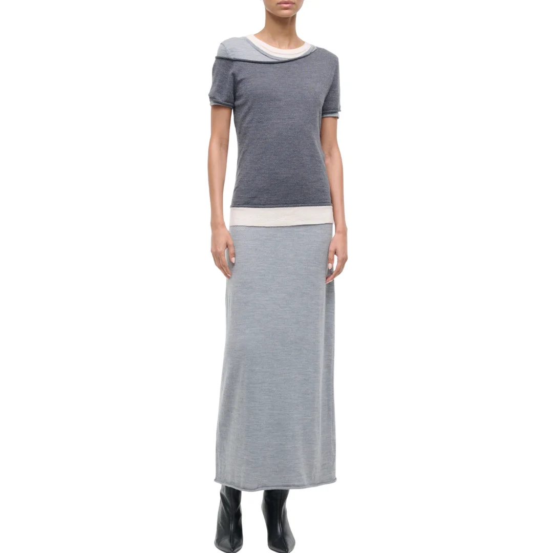 A mixed media merino wool and recycled nylon dress, the Lyric offers a pre-styled layered effect with asymmetric details - 60% Merino Wool, 40% Recycled Nylon