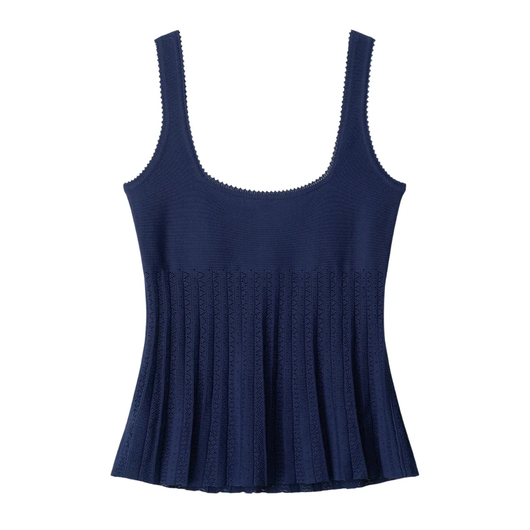 The Ellen top is a comfortable stretchy top in a pointelle compact knit, featuring bra-friendly straps and a flowy, pleated fit throughout the bodice. 80% Viscose, 20% Nylon