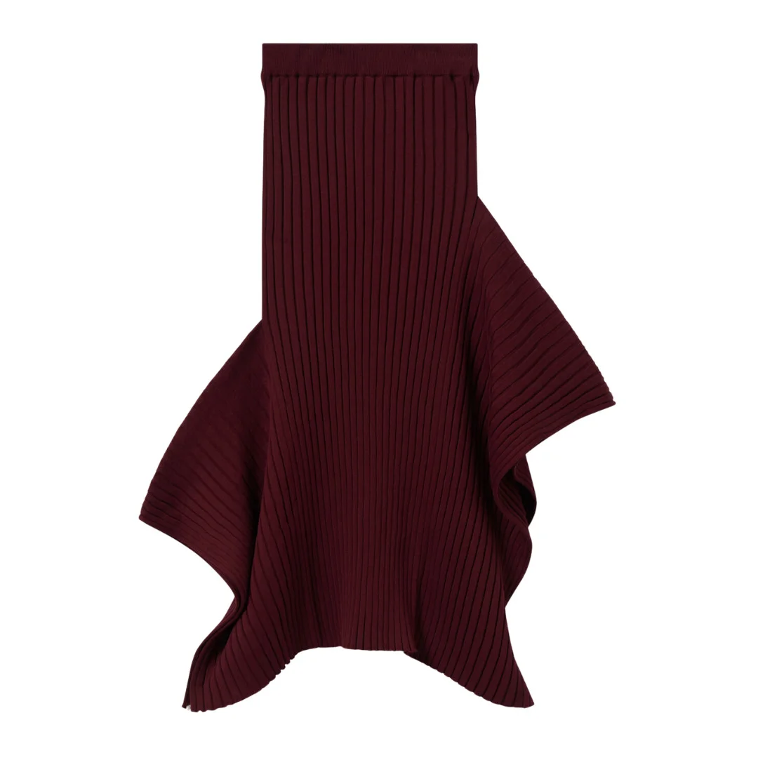 Spun from a soft, structured blend of organic cotton, this sculptural skirt begins at a high-rise waist, skimming the hips and thighs before kicking out at a flared slit by the knee. Slip it on with some kitten heels and enjoy how its architectural outline bounces with each step. - Color: Bordeaux - High-rise - Flat waistband - All-over ribbing - Slit at front right side - Kick-flared skirt - A-line - Calf-length hemline - Made in Italy
