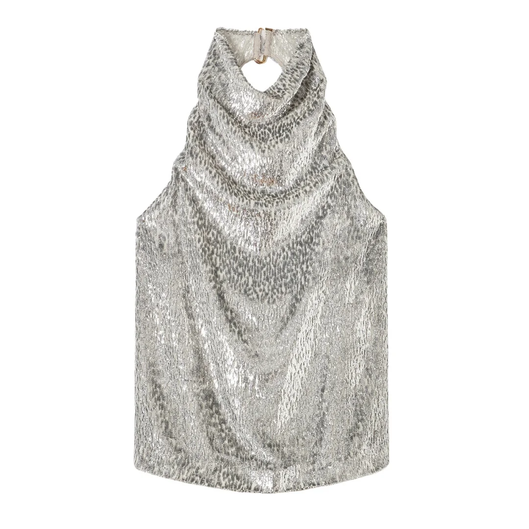 Sparkle all night long in this silk-blend top from Stella McCartney. Cut from lame velvet with an animal-inspired texture, the draped singlet has a halterneck and is drawn together by a hook fastening at the back. - Color: Silver - Halterneck - Cowl draping - Lame velvet with animal-inspired texture - Hook fastening at back - Sleeveless - Back length: 37cm